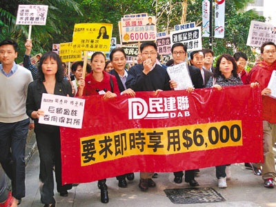 民建聯近100人,包括油尖旺區議員陳少棠、葉傲冬,深水鶧狦陪鄭泳舜、陳偉明,黃大仙區議員陳曼琪等,於昨日由中環遮打花園遊行至政府總部,向政府的代表遞交致曾俊華的公開信及2.7萬個簽名,促請政府讓市民即時享用6,000元的強積金注資。
