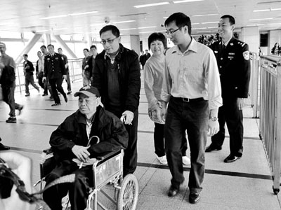 ■87歲的邱伯(坐輪椅者)退休後在內地定居,但因積蓄用盡又不合乎申請綜援資格,向工聯會求助後,昨日由立法會議員葉偉明護送回港。