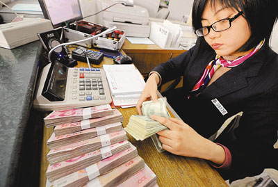 ■內地1月新增外匯佔款達5,016.7億元人民幣。圖為安徽合肥一家銀行的職員正在點鈔。資料圖片