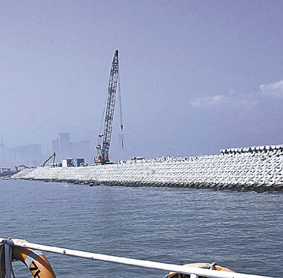 在港珠澳大橋珠澳口岸人工島施工現場,記者發現整個人工島護岸的輪廓已明顯可見,東南兩邊護岸已露出水面。珠海格力港珠澳大橋人工島發展有限公司總經理梁文梅稱,人工島已完成總投資額的1/3,護岸已基本形成,一部分陸域已經露出水面,後續施工將側重於陸域形成和地基處理。按既定規劃,2012年底整個珠澳口岸人工島2.04平方公里的陸域將浮出水面,屆時人們可在珠海拱北灣對出海面,看到一塊茶壺形狀的島嶼浮現在海上。