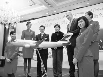 ■國泰航空推出50,000張優惠機票,即日起於網上發售,並舉辦比賽,送出1,800張免費機票。民航處處長羅祟文(左三)出席新聞發布會。香港文匯報記者曾偉龍 攝