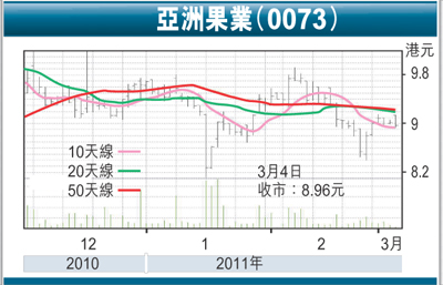 亞洲果業(0073)2011年度(年結日:6月30日)上半年的業績符合我們預期,我們因而保持對該股的盈利預測,並把該股的目標價維持於10.80元,相當於預計市盈率10.9倍。