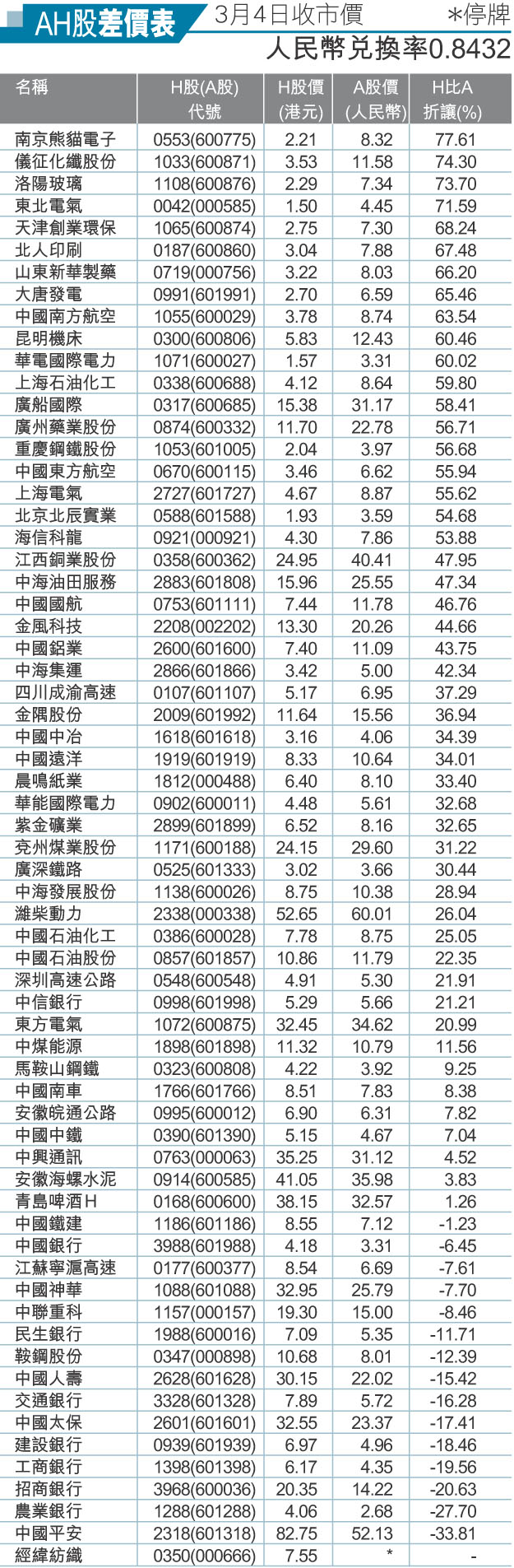 AH股差價表(3月4日收市價)