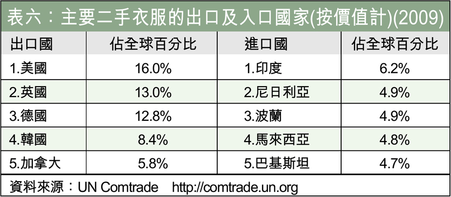 表六:主要二手衣服的出口及入口國家(按價值計)(2009)