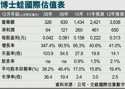我們首次覆蓋博士蛙,給予「買入」評級,目標價為6.63港元。基於總店舖面積增長4倍,當中新增店舖面積主要來自博士蛙365生活館及旗艦店,我們預計博士蛙2009年至2012年預測每股盈利的複合年增長率將可達到57%。現時公司股價相當於2011年及2012年預測市盈率的19.9倍及14.1倍,對應每股盈利增長為40.6%/41%。與博士蛙相比,中國零售行業整體加權平均預測市盈率相對較高,而加權平均每股盈利增長率相對較低(2011年預測/2012年預測加權平均市盈率19.9倍/16.3倍及每股盈利增長22.6%/21.1%),我們認為公司估值偏低。我們以貼現現金流估值法計算出目標價為6.63港元,相當於2011年預測市盈率的25.2倍。