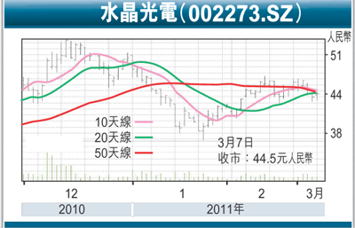 盈利預測:公司傳統業務有望維持25%以上的增速,新增業務窄帶濾光片、藍寶石襯底、微投等潛力很大,預計公司2011年-2013年每股盈利(EPS)分別為1.17元、1.66元和2.20元,按照昨日收盤價計算,動態市盈率分別為40倍、28倍和21倍,鑒於公司良好的成長性,維持其「增持」投資評級。