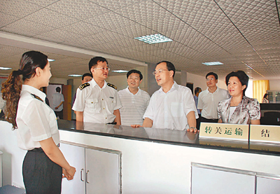 ■武漢市委書記阮成發(右三)、東西湖區委書記晏蒲柳(右一)、東西湖區長汪祥旺(右四)調研保稅物流中心。