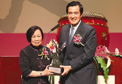 ■馬英九(右)追贈辜振甫「兩岸和平特殊貢獻獎」,由其遺孀辜嚴倬雲(左)代領。中央社