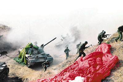 大漠深處,戰役發起後,空降第一梯隊裝備戰損量和彈藥消耗量不斷增大。後方指揮所果斷決定:向突擊隊前送武器彈藥。傘降彈藥和裝備迅速被投放到指定地點。彈藥補充小分隊不到3分鐘就熟練地將12個鎖u全部打開,一門門火炮、一箱箱彈藥隨即被運送到戰場前台……