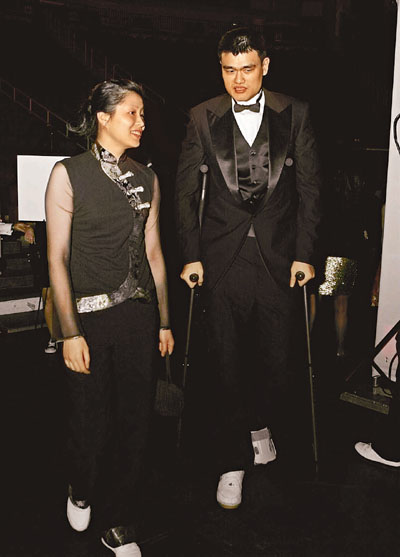 ■姚明(右)拄著拐杖同妻子葉莉出席慈善活動。新華社