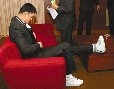 面對大家的鏡頭,姚明說道:「 很久沒有接受採訪了,我也很久沒有看到這麼多閃光燈對著自己,我的眼睛都有些不適應了。我現在就是在家康復,每隔一段時間去覆查一下,檢查恢復的情況。」晚會上,姚明還笑侃著:自己為了這頓晚宴連午飯都沒吃,引來一陣哄笑。