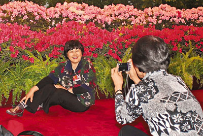 香港文匯報訊 (兩會記者組 趙一存 北京報道) 全國政協十一屆四次會議昨日在京閉幕,在參政議政的繁忙中共同走過了11天的時間,臨別時分,委員們顯得頗為不捨。閉幕會議結束之後,當大會堂的燈全部亮起來的時候,委員們緩步走出會場,卻未如往常一般,匆匆離去,而是湊在一起,互換名片、互道珍重,以期日後再聯絡。記者在現場看到,會場門口的花叢旁,圍著很多等待拍照留念的委員。他們以中央大廳的《迎春圖》畫作為背景,以畫作下面的鮮花為襯托,留下一個個美好的瞬間。