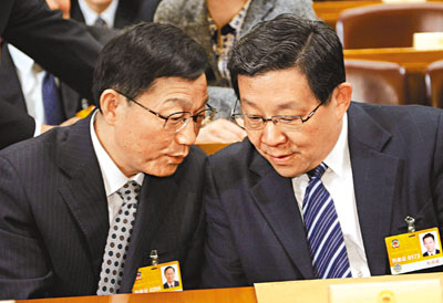 ■在全國政協閉幕大會上,財政部部長謝旭人(左)與商務部部長陳德銘交談。 中新社