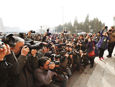 全國政協會議閉幕會後,記者在人民大會堂前搶拍步出會場的全國政協委員。 新華社