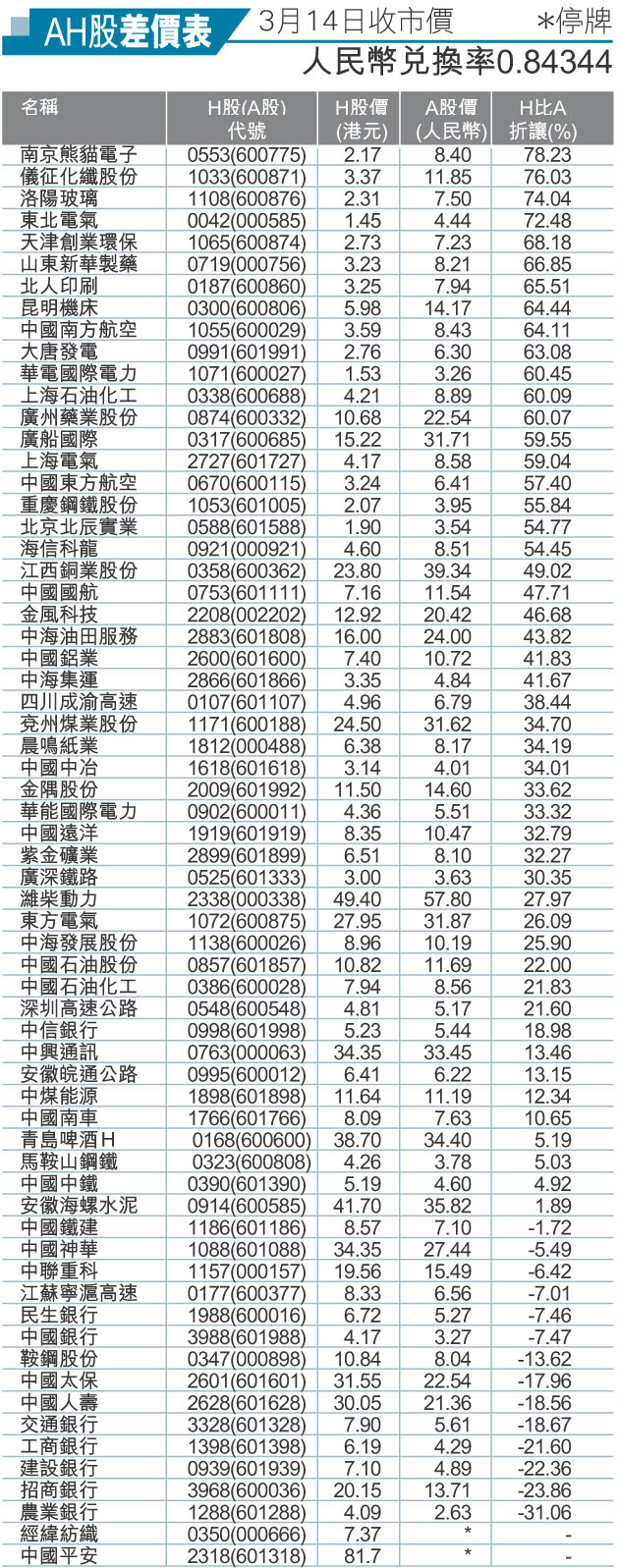 AH股差價表(3月14日收市價) (2011-03-15) (圖)