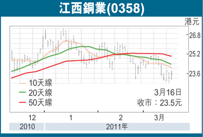 日本大地震災後重建概念股近期一直成為市場主要尋寶對象,江西銅業(0358)本可視為其中一隻主要受惠股,但觀乎該股近日表現並不算出色,因此有繼續留意的價值。事實上,日本於大地震後已令其銅冶煉廠受到嚴重破壞或因電力中斷而停產,而隨著未來的災後重建啟動,對銅的需求也將大增,中國毗鄰日本,有條件成為銅的主要供應商之一。江銅的銅金屬儲量約佔全國已探明可供工業開採儲量的三分之一,作為行業龍頭股,自然可望成為主要受惠股。