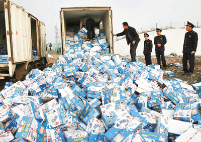 ■2008年,三鹿奶粉被驗出含有可致腎結石的三聚氰胺,當局立刻進行銷毀工作。 資料圖片