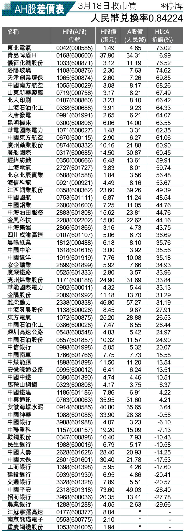 AH股差價表 (2011-03-19) (圖)