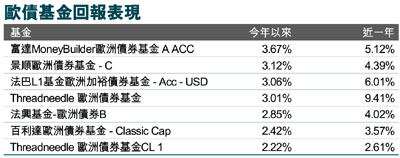 比如佔今年以來榜首的富達MoneyBuilder歐洲債券基金,主要透過投資以歐元結算的定息證券,以尋求收益以及資本增長。上述基金在2008、2009和2010年表現分別為-12.42%、25.73%及-0.34%,其資產百分比為94.83%債券、4.05%其他、1.01%現金他及0.1%股票,而標準差為17.5%。
