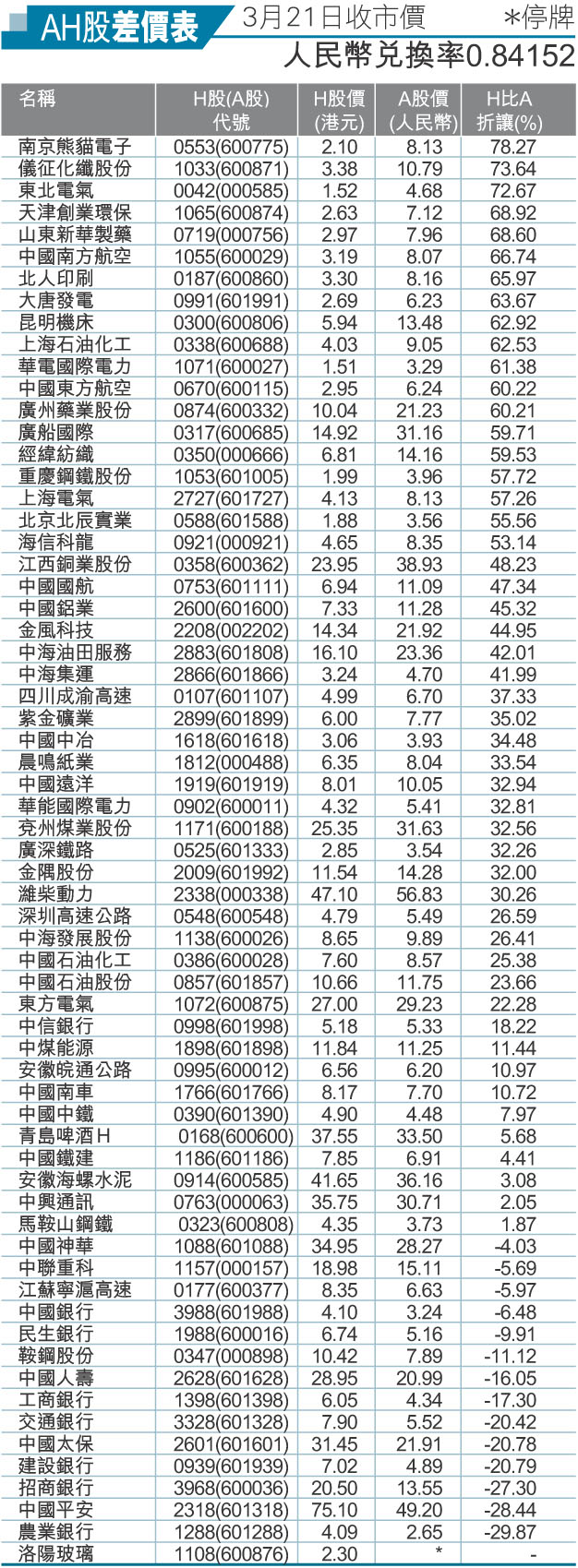 AH股差價表(3月21日收市價) (2011-03-22) (圖)