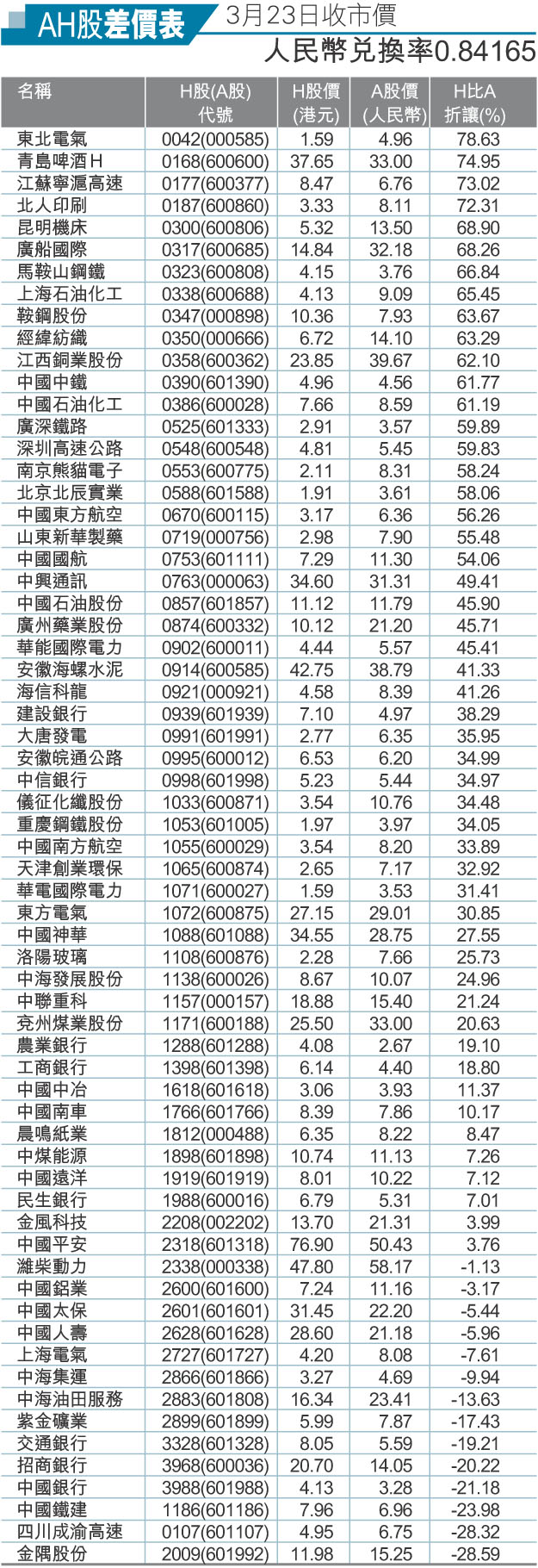 AH股差價表(3月23日收市價)人民幣兌換率0.84165