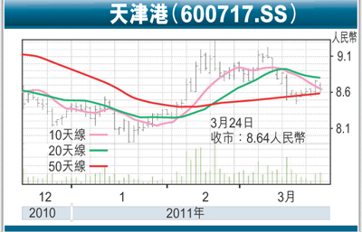 2011年3月23日,天津港(600717.SS)公告2010年年報,2010年全年實現營業收入114.83億元(人民幣,下同),同比增長17.13%,利潤總額12.94億元,同比增29.45%,歸屬母公司所有者的淨利潤8.03億元,同比增24.87%,每股盈利(EPS)0.48元。