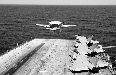 ■法國空軍E-2C空中預警機在地中海航母上起飛執行禁飛區任務。美聯社