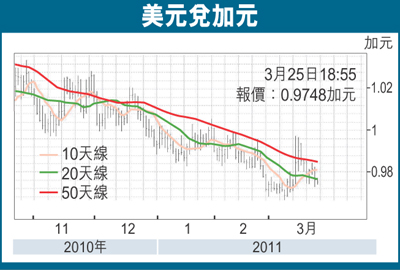 另一方面,日本在受到海嘯以及核洩漏的打擊下,日本央行已連番向貨幣市場大量注入巨額日圓,但日圓在市場流動性的增加,除了是不利於日圓往後的表現之外,日圓在市場上的氾濫將可能會加劇全球性的通脹壓力,再加上息差因素依然是不利日圓的情況下,不排除與日圓相關的利差交易活動亦將會逐漸相應增加,而澳元兌日圓以及加元兌日圓等交叉匯價於近日的顯著轉強,亦已反映出這個情況。所以在受到加元兌日圓交叉盤表現偏強的帶動下,預料加元匯價將反覆走高至0.9600水平。