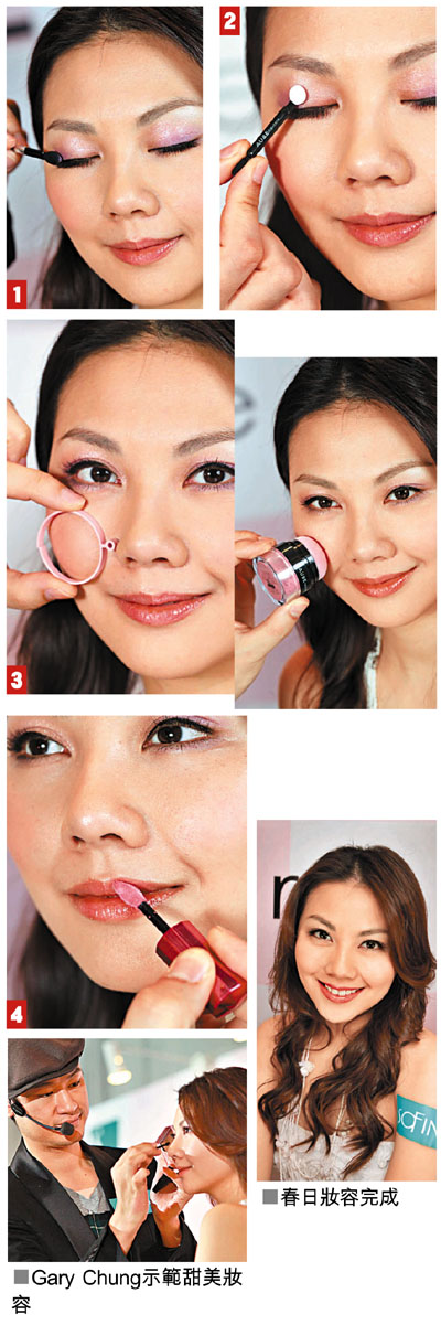 星級化妝師Gary Chung利用AUBE couture SPRING 2011的最新色澤,再配合「胭脂導向環」,塑造出今季最時尚的甜美妝容。Gary強調不需任何專業化妝掃的協助,輕鬆地以最簡單、快捷及準確的方法,亦能幻化出一個達專業水準的妝容效果,大家不妨跟他學習。