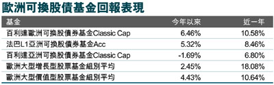 比如佔百利達歐洲可換股債券基金,主要是透過投資位於歐洲地區公司或主要業務來自歐洲的公司可換股債券,以達致中期資產增值。上述基金在2008、2009和2010年表現分別-32.28%、35.628%及1.03%,而資產行業比重為19.76%能源、17.73%非日常性消費、14.59%物料、12.51%工業、12.44%資訊科技、12.16%金融服務、3.19%健康護理及7.61%其他。