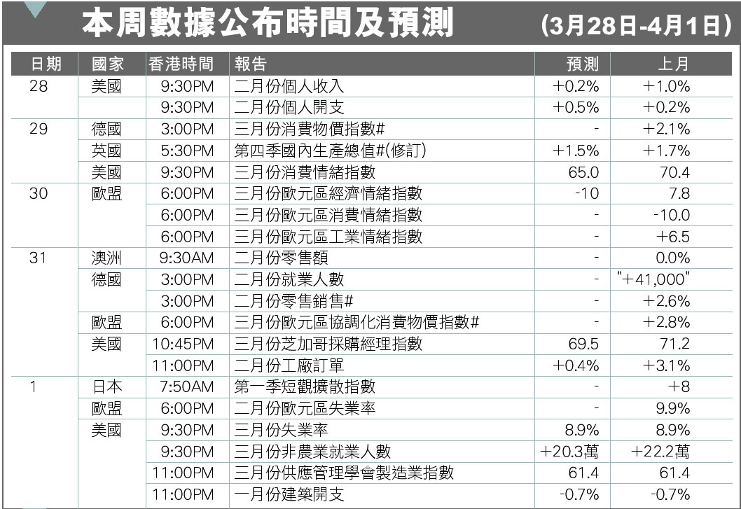 本周數據公布時間及預測(3月28日-4月1日)