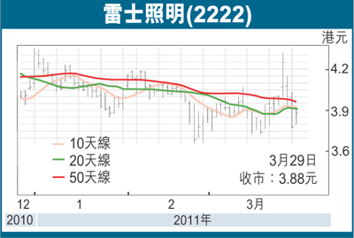 據悉,集團已加強內地市場的分銷管道建設,進一步拓寬分銷網絡的覆蓋範圍,並積極探索收購機遇,另外照明節能產品民用化亦甚具前景,未來盈利增長的潛力大。雷士近日股價在反彈至4.32元水平遇阻回落,惟退至3.77元水平已獲不俗承接,也反映自去年10月及今年2月3.65元的支持位經得起考驗,昨反彈至3.88元報收,可收集。若短期有力突破4.32元阻力,下一個目標將上移至年高位的4.53元。