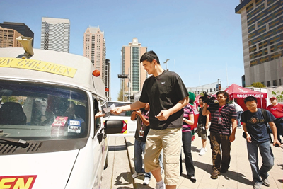 侯斯頓火箭隊中鋒姚明終於脫下保護靴,如常人般出席以倡導綠色環保為內容的義務捐贈活動。 ■新華社