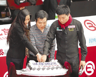 ■丁俊暉(右)與父母一起切生日蛋糕。 中體在線圖片