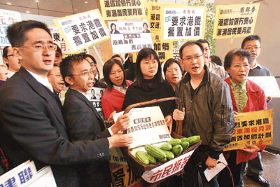 香港文匯報訊(記者 曾偉龍)港鐵將於6月依可加可減機制平均加價2.3%,昨日數十位民建聯成員及支持者到港鐵總部大樓抗議,向港鐵遞交早前收集到的近10,000個市民簽名,要求港鐵擱置加價,並推出更多票價優惠。民建聯又帶同寫上「市民捱苦」的一籃苦瓜抗議,寓意加價令市民吃苦。
