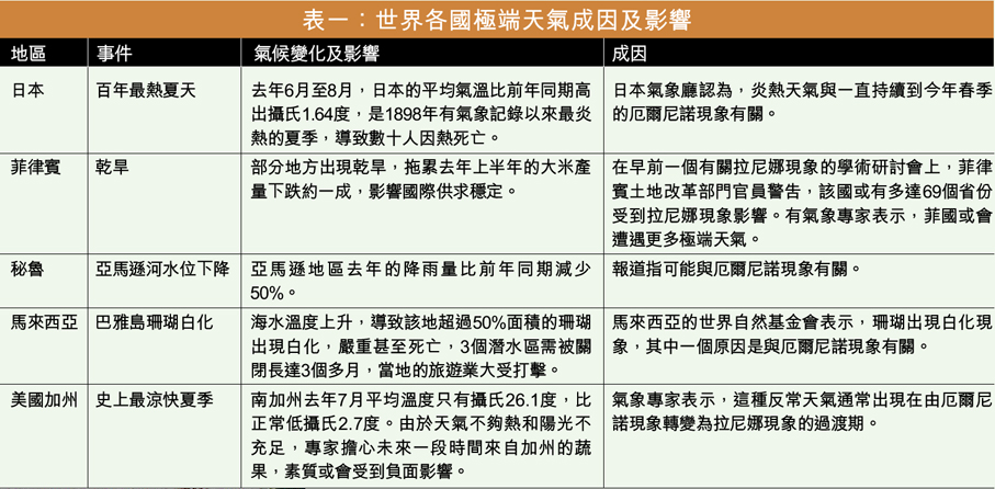 表一:世界各國極端天氣成因及影響