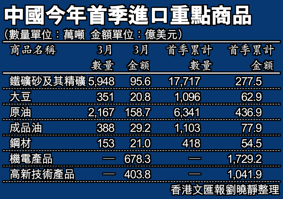 中國今年首季進口重點商品(數量單位:萬噸 金額單位:億美元)