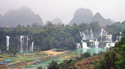 位於廣西崇左市大新縣歸春河上游的德天跨國大瀑布,橫跨中國、越南兩個國家,是亞洲第一、世界第二的跨國瀑布,與越南板約瀑布相連,寬150多米,縱深60多米。在春季,多束瀑布在綠草間悠然而下,宛如仙境,吸引眾多遊客前往觀賞。 中新社
