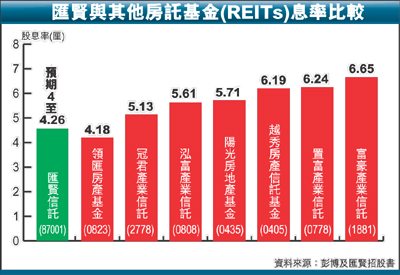 香港文匯報訊(記者 余美玉、邱婷)房地產信託基金的收入是租金,是純收租股,業務及回報穩定見稱,適合收息的投資者,故散戶最關心的也是息率回報。就招股材料看,匯賢的息率連人民幣升值因素,潛在回報達9厘,單以息率看,已算不俗,但投資者就不能對日後的股價上升抱有太大期望。