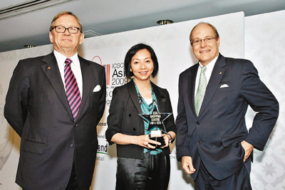 ■圓方獲國際購物中心協會頒發的「亞洲購物中心大獎」,圖為梁羡靈(中)與該會總裁Michael P. Kercheval(右)及主席Peter Sharpe合照。