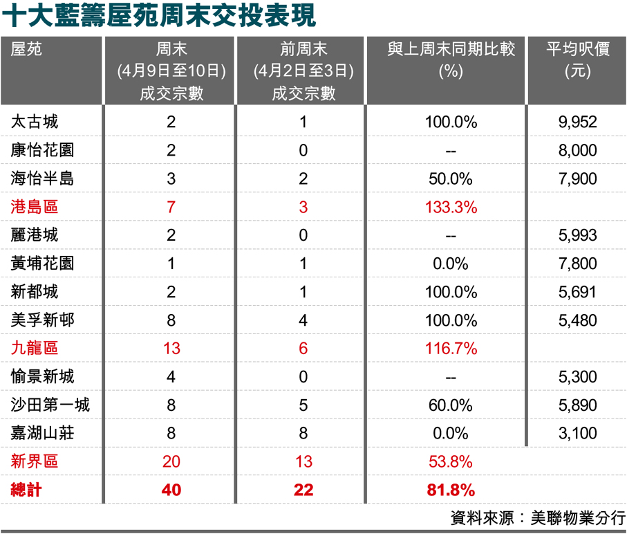 十大藍籌屋苑周末交投表現