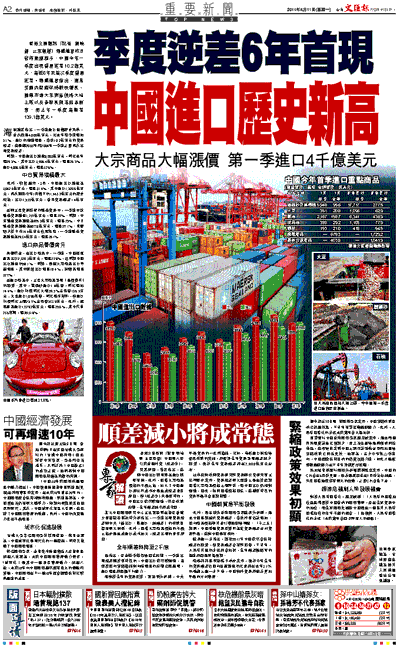 海關總署指出,一季度進口值創歷史新高,首次超過4,000億美元,比去年四季度增加5.1%。進口的強勁增長,導致10.2億美元的貿易逆差,這是繼2003年和2004年一季度之後再次出現貿易逆差。