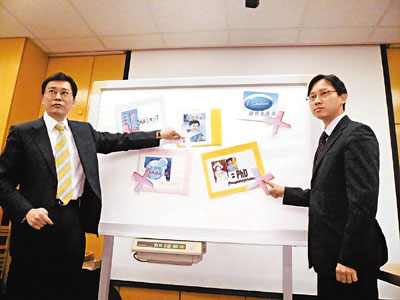 ■醫院藥劑師學會踢爆部分奶粉廣告涉誇大成分的功效吸引顧客,呼籲家長別盡信廣告。左為崔俊明。 香港文匯報記者郝君兒 攝