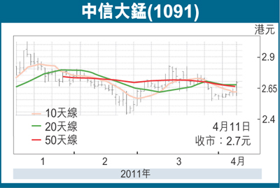 管理層較早前指出,日本災後重建將會需要大量錳鋼,部分日本企業,如汽車產業,暫時或會依靠內地的生產線;其次內地「十二五」規劃將興建3,600萬套保障房,市場對錳鋼的需求增加,將對公司業務有利。由於集團去年資本開支6.7億元,今年及明年分別是11.3億元及13.6億元,用作上游採礦及擴充下游電解錳生產線,隨著產能逐步提升,應可望迎合未來的市場龐大需求。另一方面,集團在非洲加蓬的錳礦項目今年投產後,預計產量35萬噸,明年增至75萬噸,也有助提升未來盈利表現。
