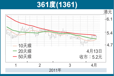 在路演過程中管理層表示,361度應會繼續成為中國運動品牌中銷售增長最高的公司之一,未來2-3年的營業額增幅為20%,且每年淨增加600-800間零售門店。管理層指,2011年度下半年的毛利率將達40%,全年毛利率約42%;廣告及宣傳開支比率將降至10%,研發開支則上升至2%,實際稅率將保持於18%,使純利率維持於20-22%的穩定水平。由於公司把ePOS系統升級並提高店舖生產力,預料2011年度下半年的同店銷售增長將繼續錄得雙位數。管理層稱,公司已計劃發展電子商務及網上銷售平台,目前已作出一些前期準備。