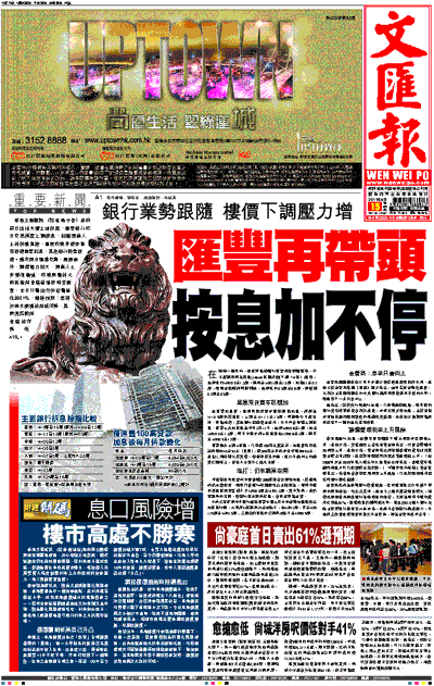 在匯豐加息後,星展昨晚深夜亦宣佈跟隨加息,將原為H+0.9厘的拆息按,上調至H+1.1至1.5厘,同樣是今日起生效。市場相信,其他銀行因應資金成本,今日料會陸續上調按息。匯豐上次加按息為本年3月11日,由原H加0.8至1厘,加至H加0.9至1.3厘;同日中銀亦將H按息率由H加0.8至1厘,調升至H加0.9至1.2厘。