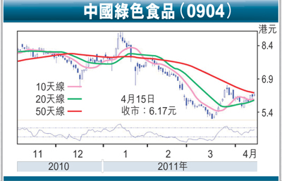 就股價表現而言,中國綠色上月17日在退至5.07元獲支持,但於28日反彈至6.6元遇阻,而近期的調整在退至5.58元已即獲支持,上周五以6.17元報收。該股2011年的預測市盈率約7倍,尚在同業中處於偏低水平,趁股價走勢改善收集,中線上望目標為2月初阻力位的8元關。