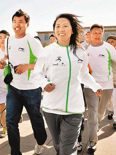 4月17日上午,前奧運冠軍王軍霞(見圖)攜兒子出現在天安門廣場上,為在這裡舉行的北京國際長跑節活動助跑。主題為「快樂長跑·活力北京」的安利紐崔萊北京國際長跑節,設立了安利小小迷你馬拉松、李寧10公里、迷你馬拉松和安利健康嘉年華四項內容,共有1萬多名來自美國、德國、韓國、日本和中國等國家的長跑愛好者參加。萬餘名中外長跑愛好者有的在天安門廣場內進行小型馬拉松賽跑,有的則從天安門起跑,一路奔跑到北京的先農壇體育場。