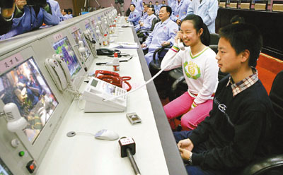 ■「神六」航天員費俊龍的兒子費迪和聶海勝的女兒聶天翔祝爸爸圓滿完成任務。