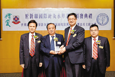 ■湯修齊(右二)、曾耀祥及李鋈發總理頒贈紀念品予世界針灸學會聯合會主席鄧良月。